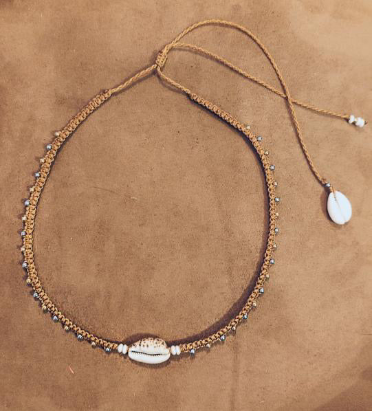 Orné de coquillages soigneusement cueillis sur les plages locales, ce collier unique est enrichi de petites billes dorées et argentées, ajoutant un éclat discret qui se marie harmonieusement avec les tons naturels du macramé.